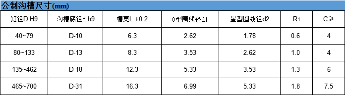標準材料 O形圈:丁腈橡膠NBR或氟橡膠FKM星形圈:丁腈橡膠NBR或氟橡膠FKM特點-在需要將兩種介質分離(例如:流體/流體或流體/氣體)的場合,密封效果好-集低摩擦與高彈性于一身,具有雙重安全性-氣體滲透率低-高壓應用場合,滑動性能好-滑動性能好,無爬行現象-溝槽結構簡單,安裝簡單支持 | 環保 | 優質 | 廠家 | 加工 | 質量 |